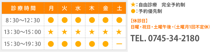 診療時間 | *予約優先制 午前8:30~12:30/午後15:30~19:30 *完全予約制(自由診療) 13:30~15:00 |
